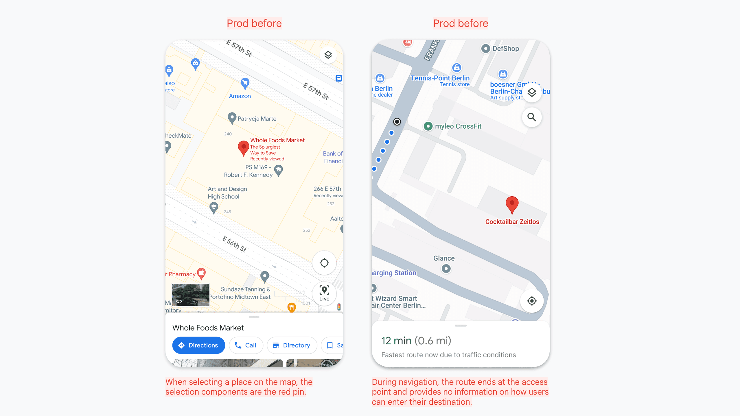 As the lead and sole UX designer on this initiative, I partnered with a visual designer and UX researcher to define how entrances should appear on the map in a way that adds user value without contributing to visual clutter. Because this was a net-new map component, we had to design not just for one surface but for a system: a reusable entrance component that could scale across multiple product areas and user journeys.