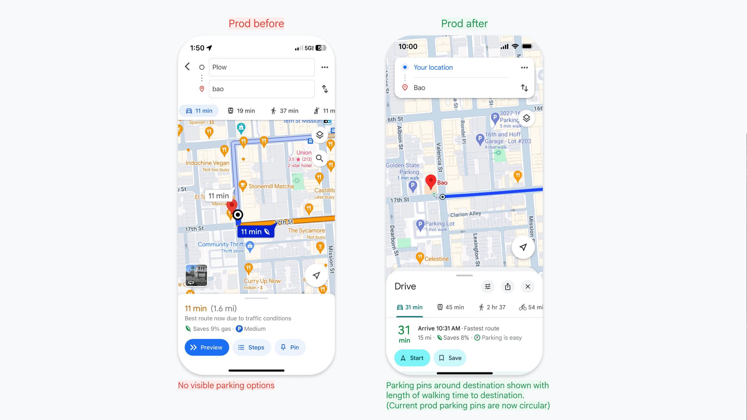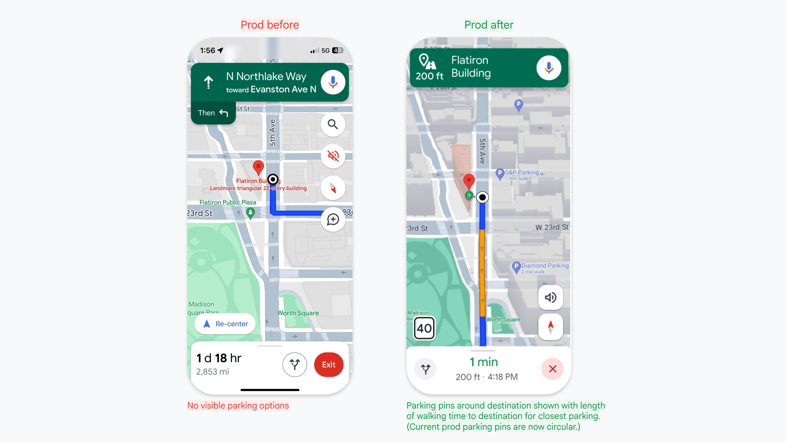 As drivers approach their destination in Google Maps, nearby parking lots and garages now appear as parking pins on the map — enabling more efficient, confident, and safer arrival experiences. Prior to this launch, users received no parking guidance during the critical last moments of navigation.
